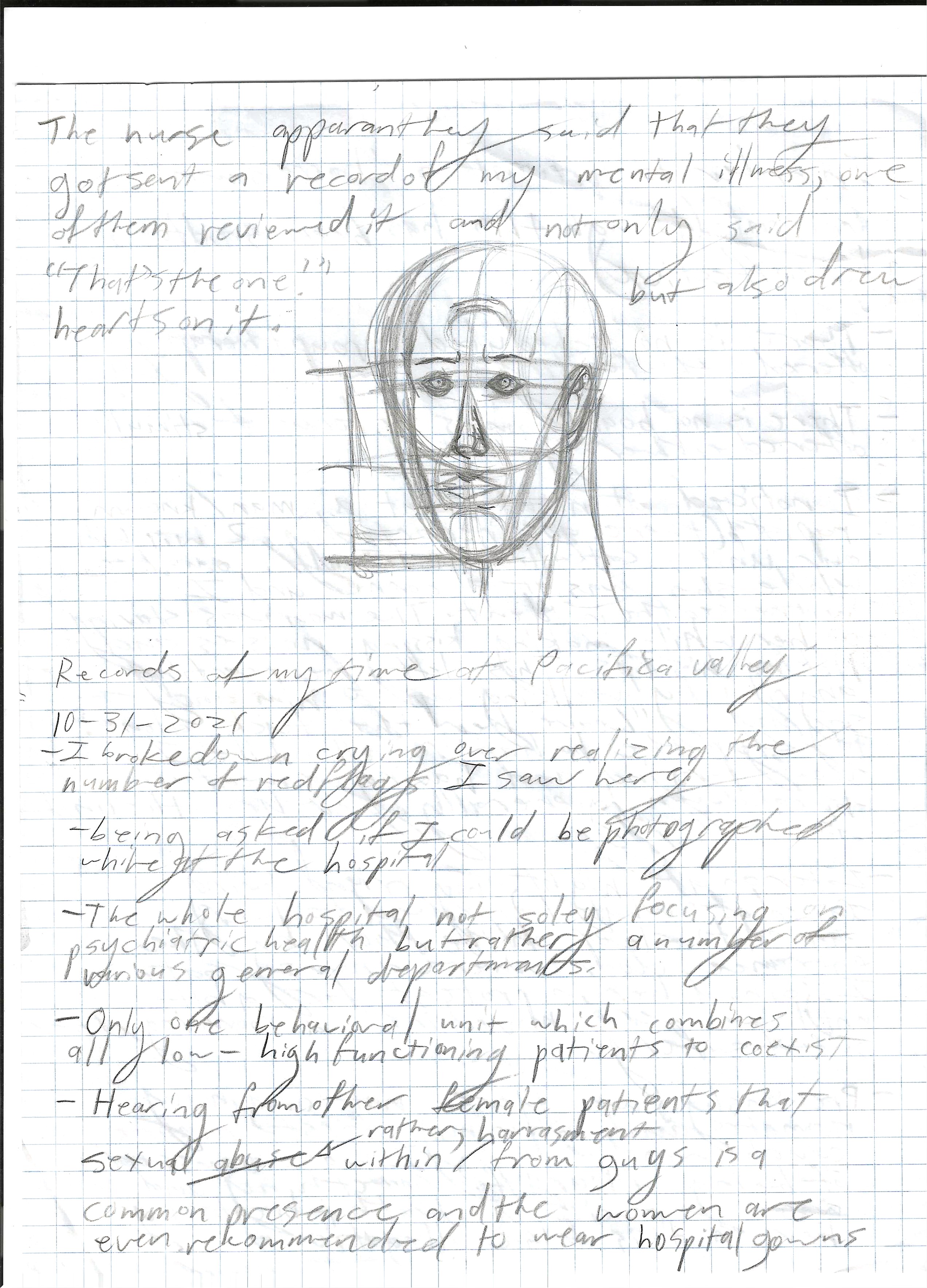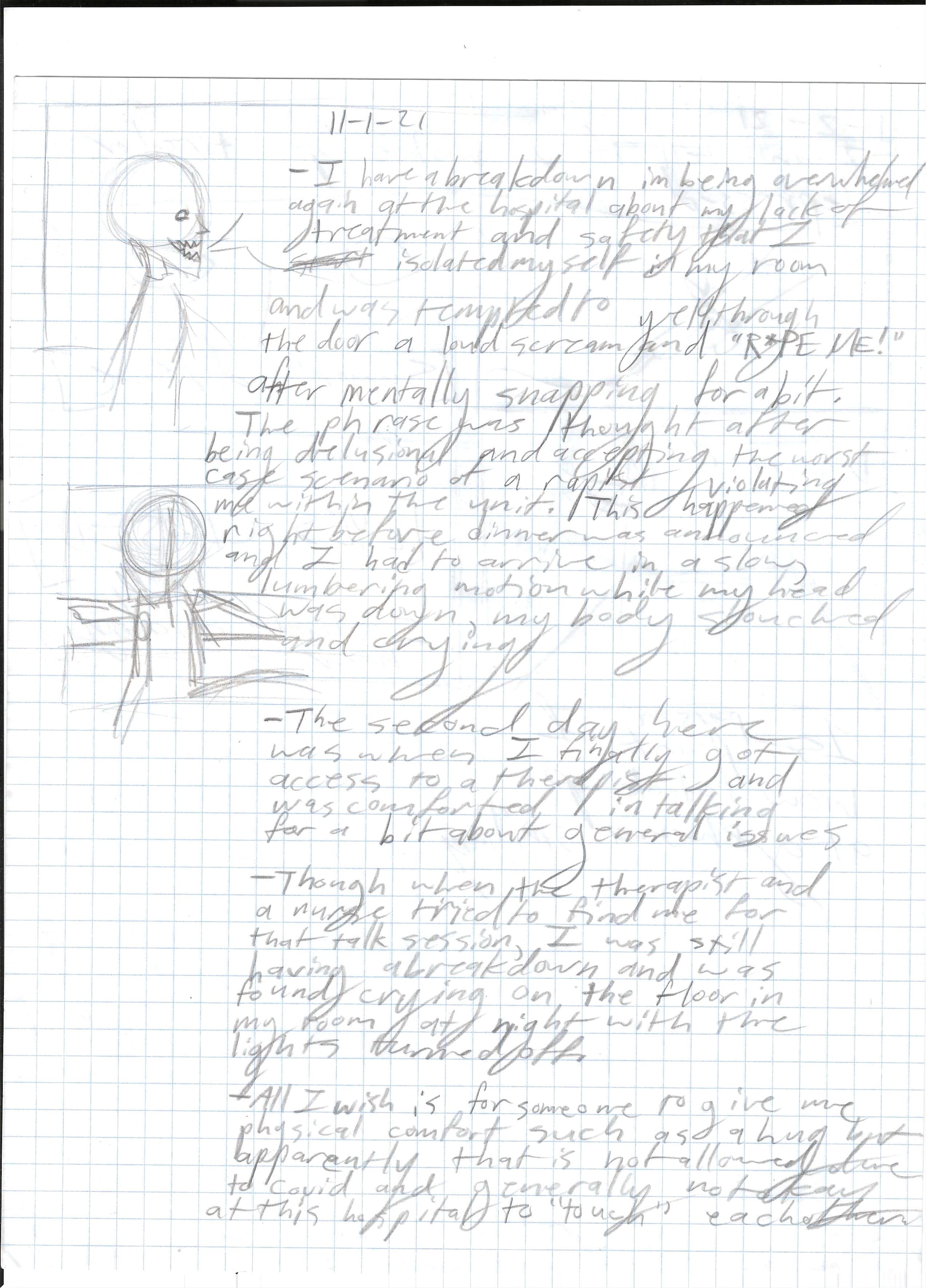 In some parts of her journal entry, she mentions a psychiatrist (an old middle aged man) who was assigned to everyone of us in the facility, hence why he would only speak to her (and I as well in my experience) for about a minute before assigning us a random medication without further intake about our psyche. Despite being a psych unit, we were not ever scheduled with any sessions of group therapy as it should have (as what my previous psych hospital always did) and instead held activity session that seemed more like a child recess than one meant for adults: Having everyone huddle in another room across the patio, entering the left side of the hallway with nothing else to do but fill in child-level coloring pages, child-level cross puzzles and freely drawing anything on paper with crayola markers while someone played music from a bulky radio. Adults in their early 20s and mid 40s/50s gathered together in this only stimuli that was ever offered and it was dehumanizing to me. I’m not sure when at some point I came to this thought but I really wondered how someone could lock away a person behind a small facility, in a forgettable place within a giant hospital, knowing they need help to just wither with other unstable people on the same floor.