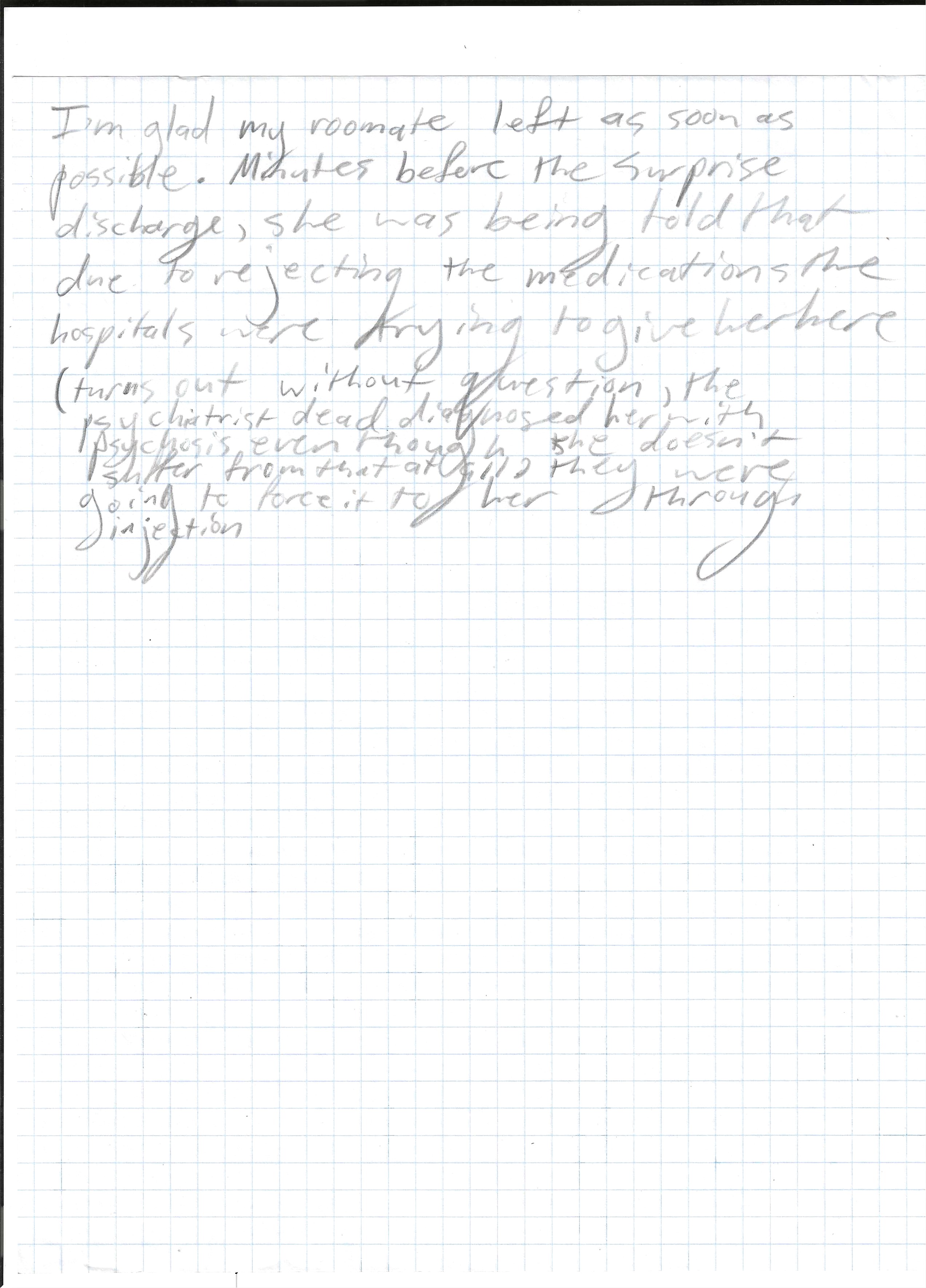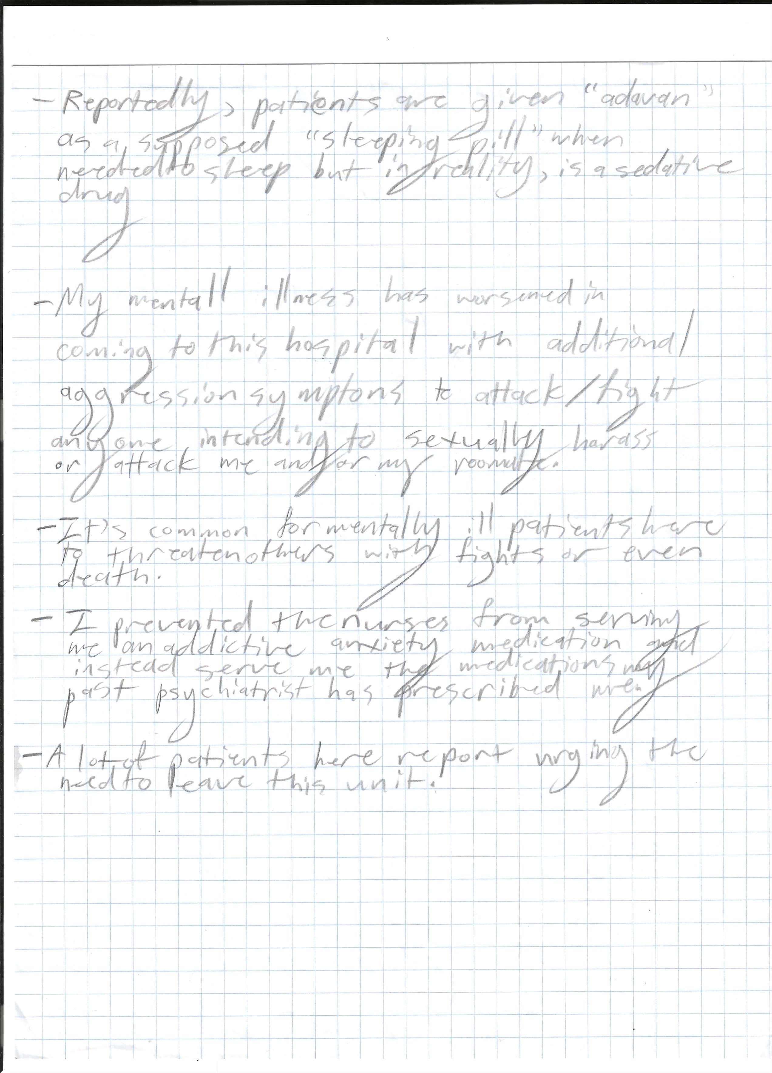 Going back to the evening on day 1, that was the only time in which everyone settled down and left the hallway quiet in favor of sleep. While it took away a lot of anxiety and real danger I had for myself temporarily, the quiet night was silently filled with aggression. A feeling I would become more and more familiar with for the first time in my calm mannered life and would blanket my anxiety. Before everyone headed to sleep, they were offered a “sleep medication” that I was told by a patient was actually a sedative (Ativan). Me not yet having received this medication, I saved myself from ingesting it by asking the staff if I may take other medications I was prescribed previously by my psychiatrist (outside the hospital) at the time to help me sleep. While I was very lucky to avoid this medication, my roommate Jennifer wasn’t so and documented about this along with her own experience about being here in the hospital: