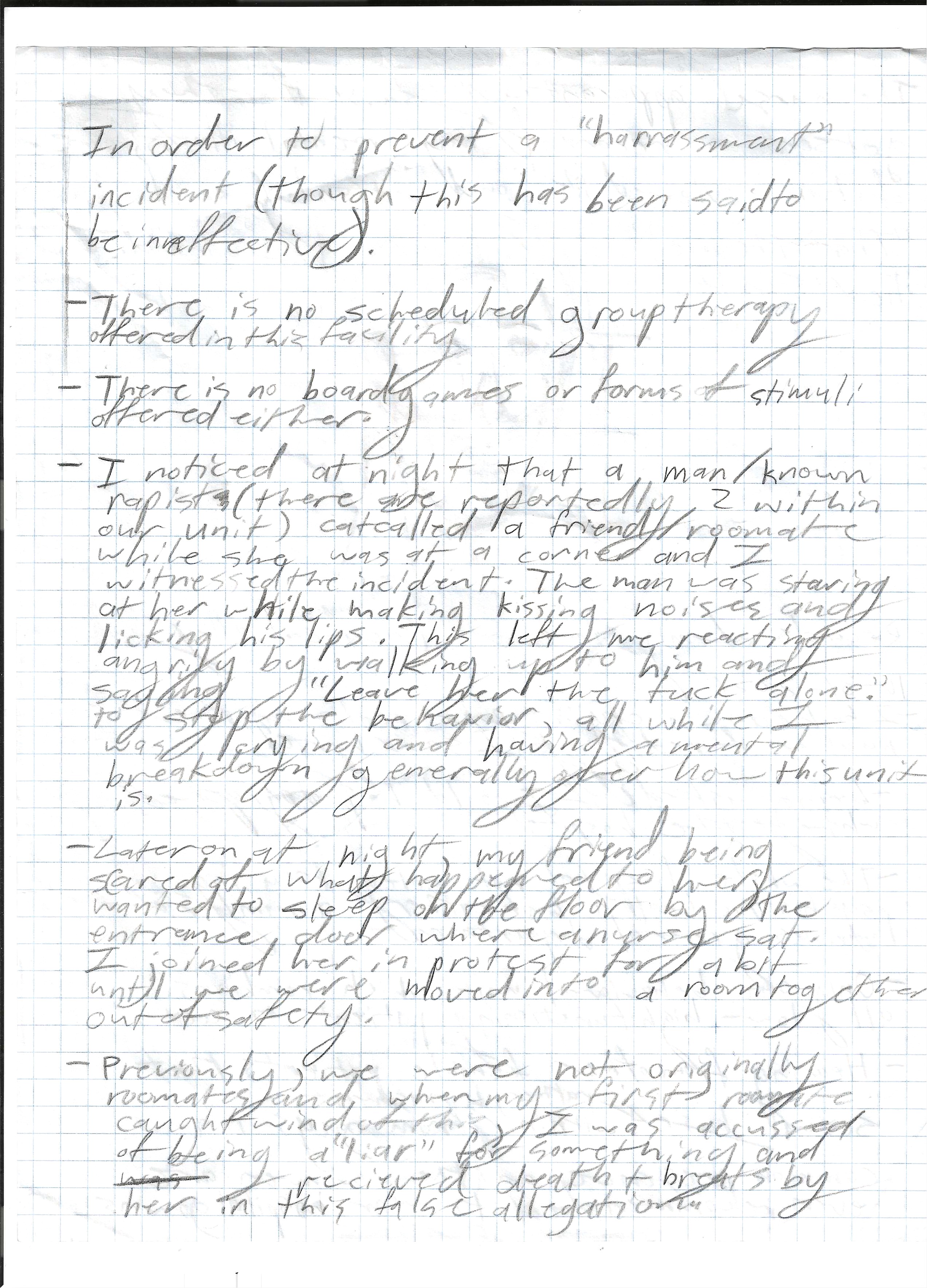 -I noticed at night that a man/known rapist (there are 2 reportedly within our unit) catcalled a friend/roomate while she was at a corner and I witnessed the incident. The man was staring at her while making kissing noises and licking his lips. This left me reacting angrily by walking up to him and saying “Leave her the fuck alone.” to stop the behavior, all while I was crying and having a mental breakdown generally over how this unit is.