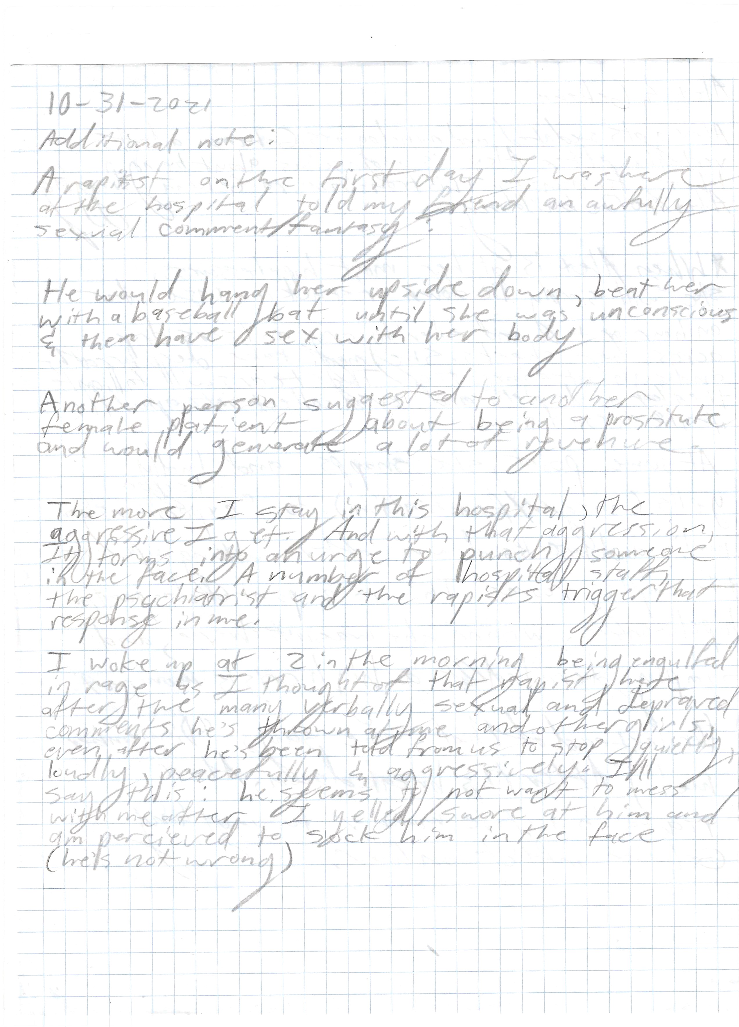 11-4-2021. My physical hell is over. I told all the people who I protected and joined my crew to do the same for the next women that get admitted to this place while that creep is still around, and I come back home with an intense rage and urge to be hospitalized not due to the original suicidal ideations I’ve had starting this whole venture, but to keep myself away from hurting anyone as I basically retrained my brain to perceive the world as dangerous and need to be on edge in case anyone were to attack or harass me/other girls. This one admission to a horrible hospital resulted in another 3 that I spent back at the original hospital I first went to. While years have passed since then, I still think about this incident and feel like it eats me up everyday even after having therapy over this. I for a while was on edge all the time walking through the streets at seeing a guy cross my path, even after I transitioned as a guy, due to the instinctive reaction of reliving the memories that plagued my mind. I was always alert for any girl I saw in public interacting with a guy. While I knew my original intentions of doing this in the hospital, it plagued me as irrational behavior once I was brought back to my community. I felt like shit and I still kinda do, but time has treated me kindly with allowing me to slowly process this whole situation. With this eating me up, I feel like I wanted to put this out there. Somewhere. As a literal statement of throwing something out to the world. I may not be able to reverse the past, but I simply wish to find closure, whether that’s by sharing this story or letting my own emotions out.