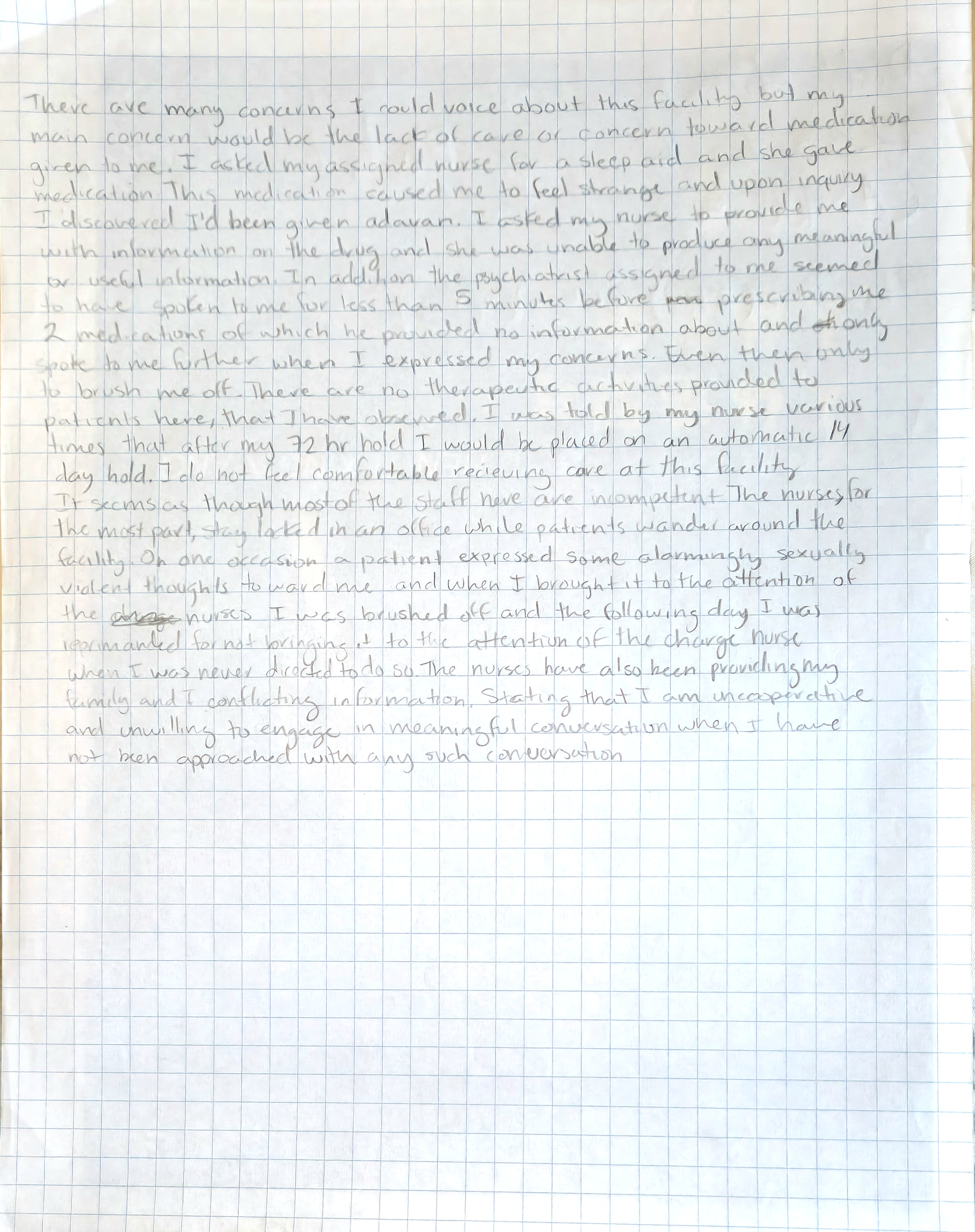 "There are many concerns I would voice about this facility but my main concern would be the lack of care or concern toward medication given to me. I asked my assigned nurse for a sleep aid and she gave me medication. This medication caused me to feel strange and upon inquiry, I discovered I’d been given adavan (ativan). I asked my nurse to provide me with information on the drug and she was unable to produce any meaningful or useful information. In addition the psychiatrist assigned to me seemed to have spoken to me for less than 5 minutes before prescribing me 2 medications of which he provided no information about and